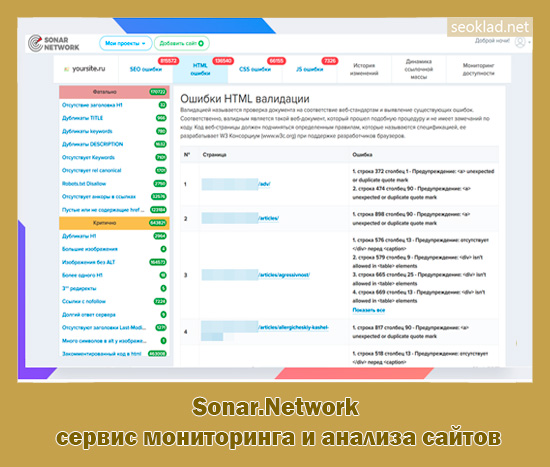 Приведем простой пример: исходя из отчета, на моем сайте множество ошибок. Sonar Network проанализировал сотню страниц и выявил следующие недочеты:
